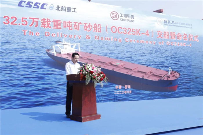 上午9:00,武船集團北船重工為工銀租賃和招商輪船建造的第四艘32.5萬噸礦砂船“ORE CHONGQING”輪命名暨交船儀式在3號碼頭舉行,這是各方在黨中央的正確領導下,抗擊疫情取得的重要成果。工銀租賃航運金融事業部副主管賈浩、北船重工總經理谷克超代表雙方簽署了交船議定書。