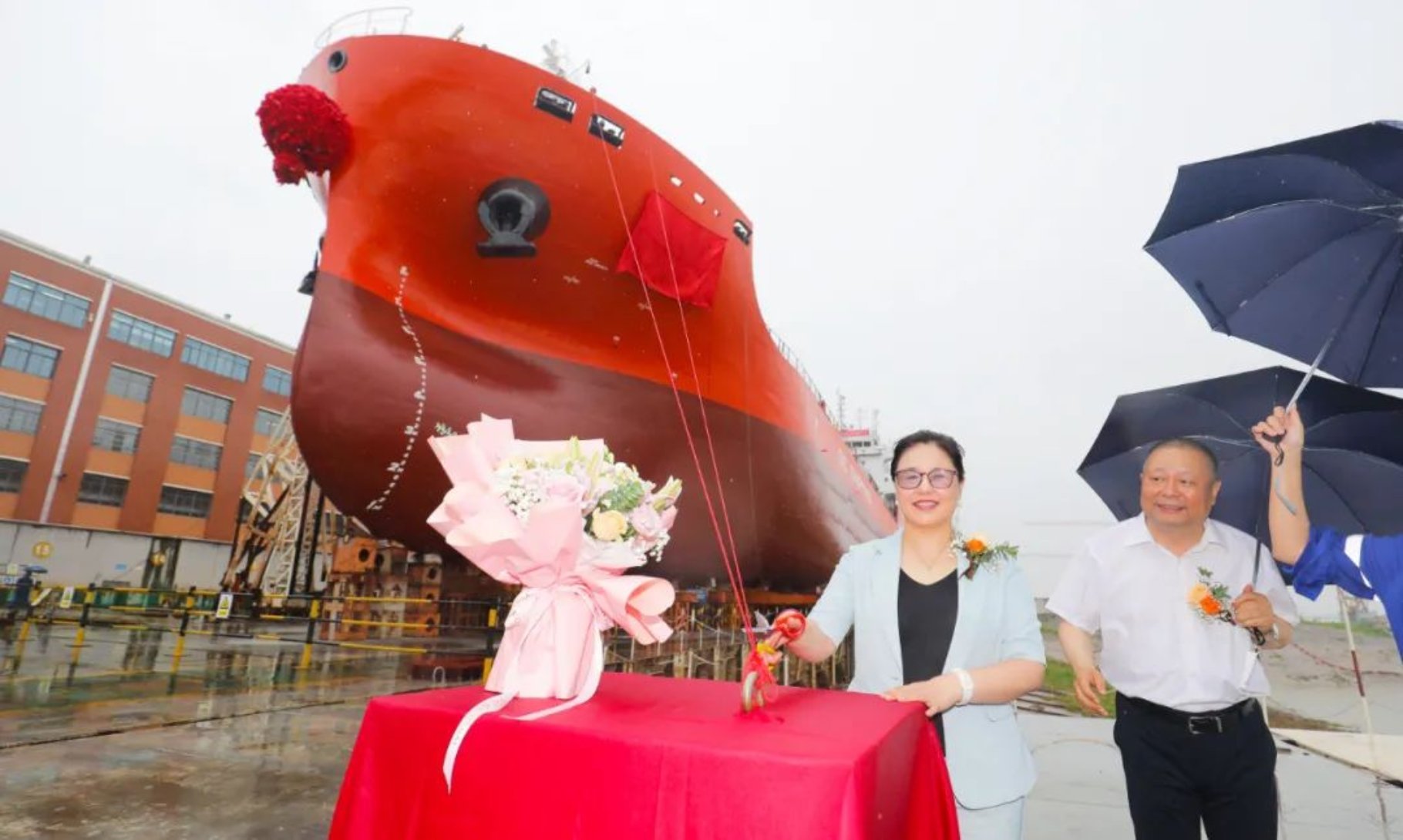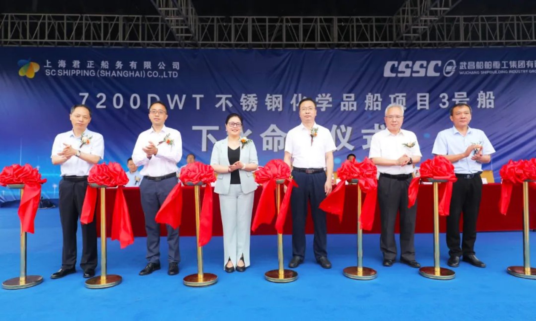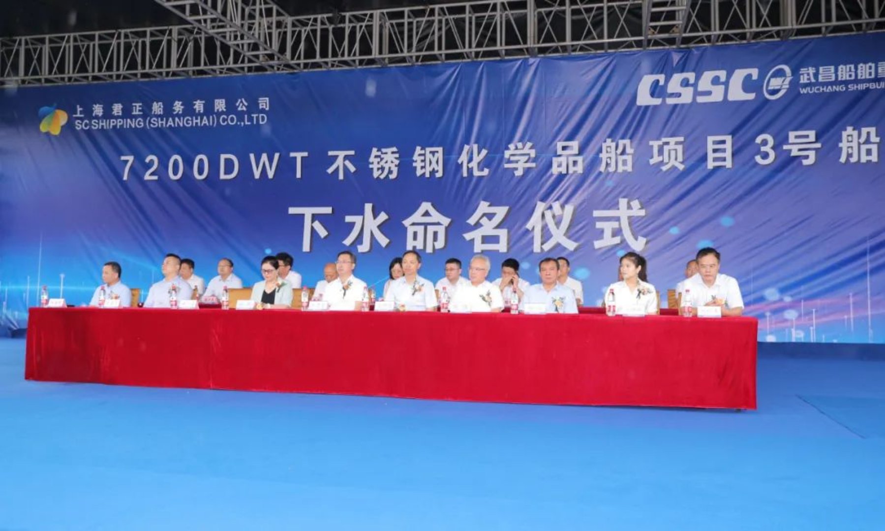 7月20日上午,在喜悅的鑼鼓聲中,由中國船舶集團武昌造船為上海君正船務有限公司建造的第三艘7200DWT不銹鋼化學品船月丹在雙柳廠區順利下水!上海君正物流常務副總經理吳貴榮,武昌造船黨委副書記、總經理梁師清,中國船級社副總裁范強,中海殼牌石油化工有限公司供應鏈總監陳鵬,上海船舶研究設計院副院長周志勇等相關領導出席儀式并剪彩。