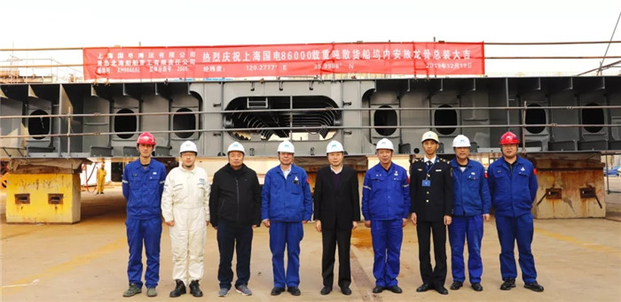 上海國電海運有限公司副總經(jīng)理韓青、中國船級社青島分社驗船師肖楠、青島海事局鄭文杰、北船重工副總經(jīng)理于寶月及相關部門負責人出席86000噸散貨船1、2號船鋪底儀式。