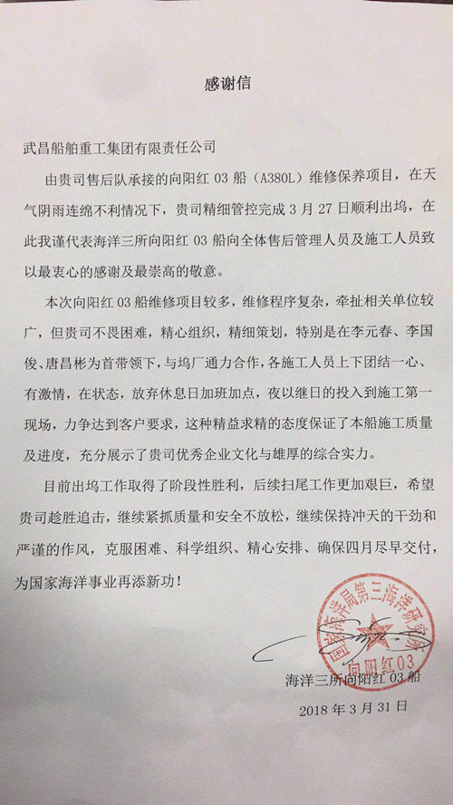這封姍姍來遲的感謝信中,國家海洋局海洋三所表達了對武船集團全體售后人員最衷心的感謝及最崇高的敬意,特別對公司售后小組精心組織策劃、團結一心、夜以繼日、精益求精的態度給予高度贊揚和肯定!