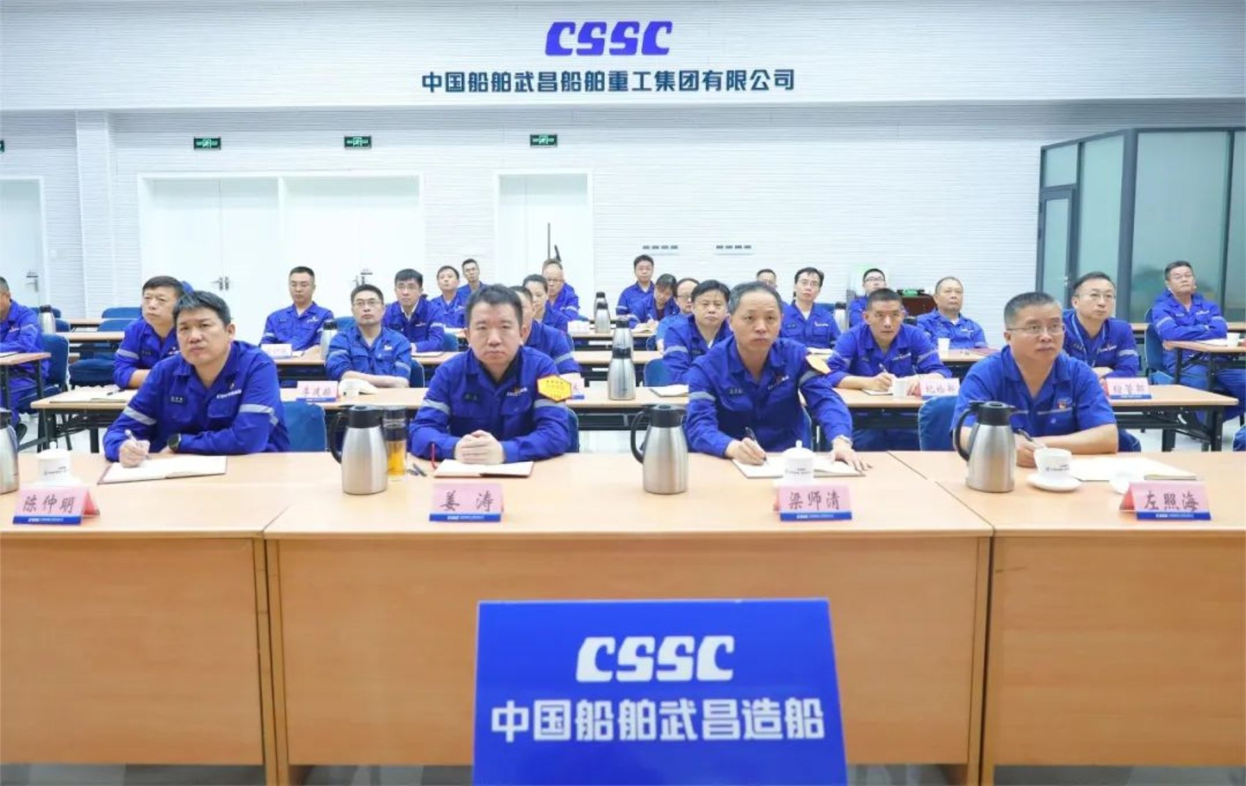 會議以視頻形式召開。武昌造船領導班子成員姜濤、梁師清、陳仲明、左照海,公司助理級領導,各單位負責人在武漢以視頻形式參加會議。