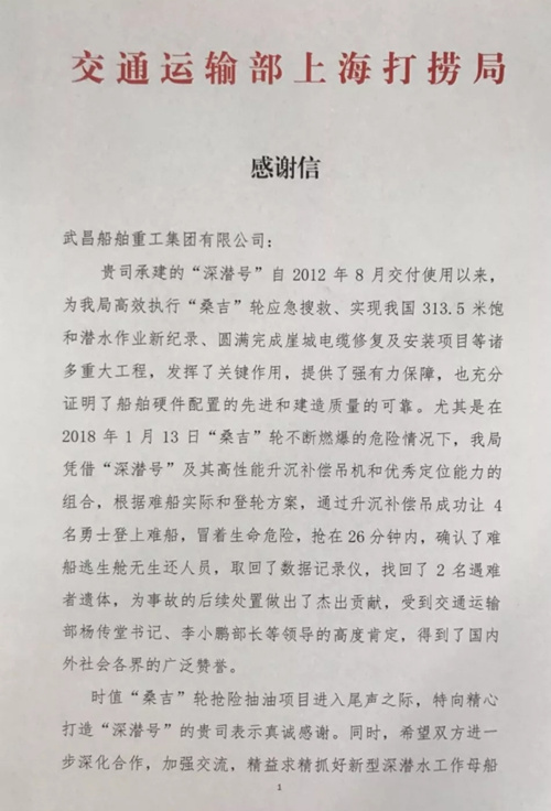 由武船集團為交通部上海打撈局建造的“深潛號”深潛水工作母船,自2012年8月交付以來,為船東執(zhí)行多項重大工程,發(fā)揮關鍵作用,充分證明了該船硬件配置的先進性和建造質量的可靠性。尤其是在2018年1月13日“桑吉”輪搶險項目中,憑借著“深潛號”及其高性能升降補償?shù)鯔C和優(yōu)秀定位能力的組合,為事故的處置做出了杰出貢獻。憑借著該船優(yōu)異的實際表現(xiàn),船東特發(fā)來感謝信對武船集團表示肯定。