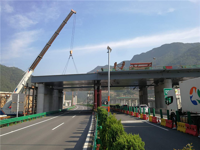 濟祁高速三覺互通連接線新橋大橋項目為單拱斜跨斜拉橋,分為鋼箱拱、鋼梁橋面結構和人行梯道橋三部分,工程總噸位約為5400噸,其中大橋主拱跨徑170米,主拱高度72.6米,主拱結構總重約2000噸,主拱軸線與橋梁縱向水平面夾角為25度,新橋大橋主拱的順利合攏為后續大橋鋼梁橋面結構的施工奠定了堅實的基礎。