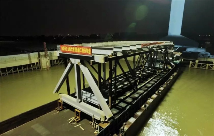 ▲白洋長江大橋主橋首個鋼桁梁節(jié)段裝船發(fā)運(yùn)