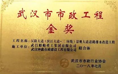 2018年8月,武漢市市政工程金獎(jiǎng)評(píng)選工作如期開(kāi)展,武船集團(tuán)交通研究院參與建設(shè)的漢陽(yáng)大道(濱江大道~三環(huán)線)景觀大道工程被評(píng)為武漢市市政工程金獎(jiǎng)。