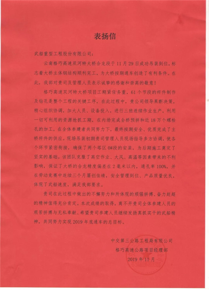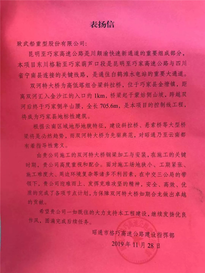 ▲武船重工股份獲昭通市格巧高速公路建設指揮部書面表揚
