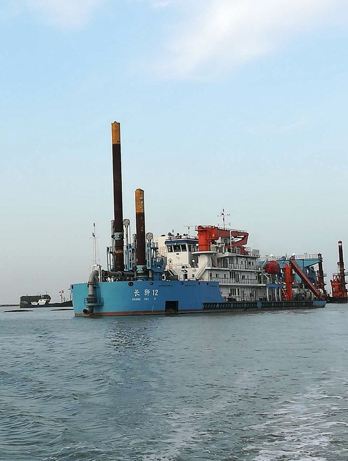 5月17日起,“長獅12”鋼樁定位系統在江蘇鹽城濱海港多個水域先后實現了主輔鋼樁立樁、下樁、定樁、升樁,以及臺車系統驅動行走試驗。試驗過程中,兩根長達42米的巨型鋼樁先后順利插入水底約5米深度,將挖泥船牢牢定位在水流湍急的海面上。在臺車系統和主輔鋼樁聯動作用下,挖泥船實現了連續扇形挖泥動作。十多天的聯調試驗過程中,主輔鋼樁部套同臺車系統完成了十多次聯調試驗,全部取得成功,充分驗證了2000m3/h自航絞吸挖泥船“長獅12”鋼樁定位系統的功能性、穩定性和可靠性,順利通過長江航道局報檢驗收。