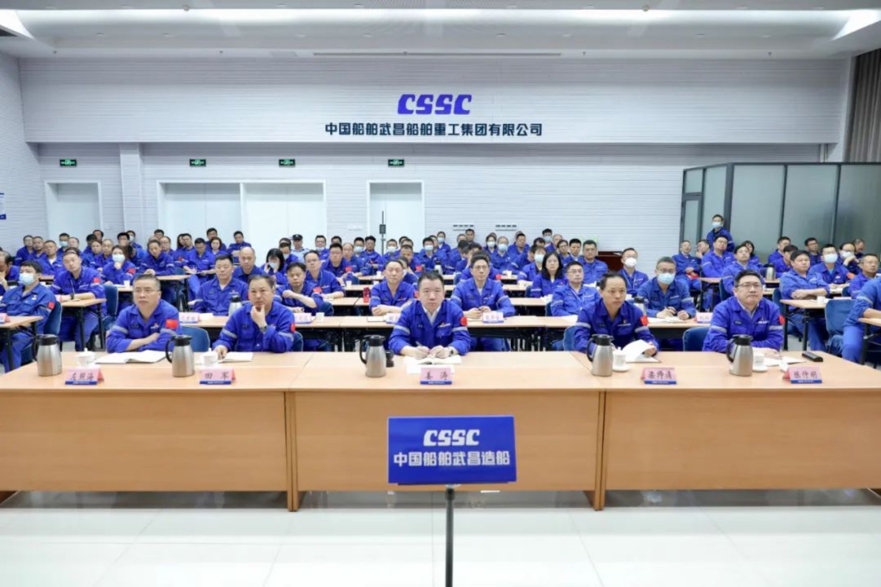 會議以視頻形式召開。武昌造船領導班子成員姜濤、梁師清、田軍、陳仲明、左照海,公司助理級領導,各單位負責人在武漢以視頻形式參加會議。