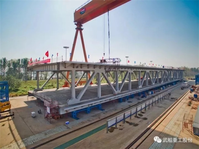 大橋全橋共51節(jié)鋼桁梁節(jié)段分9個(gè)輪次在武船雙柳基地進(jìn)行總拼制造,單個(gè)標(biāo)準(zhǔn)節(jié)段長(zhǎng)36米,重約1050噸,高12.5米,超重、超寬、超高成為了該橋最大的特點(diǎn),一個(gè)節(jié)段就達(dá)到了一座小橋的規(guī)模。