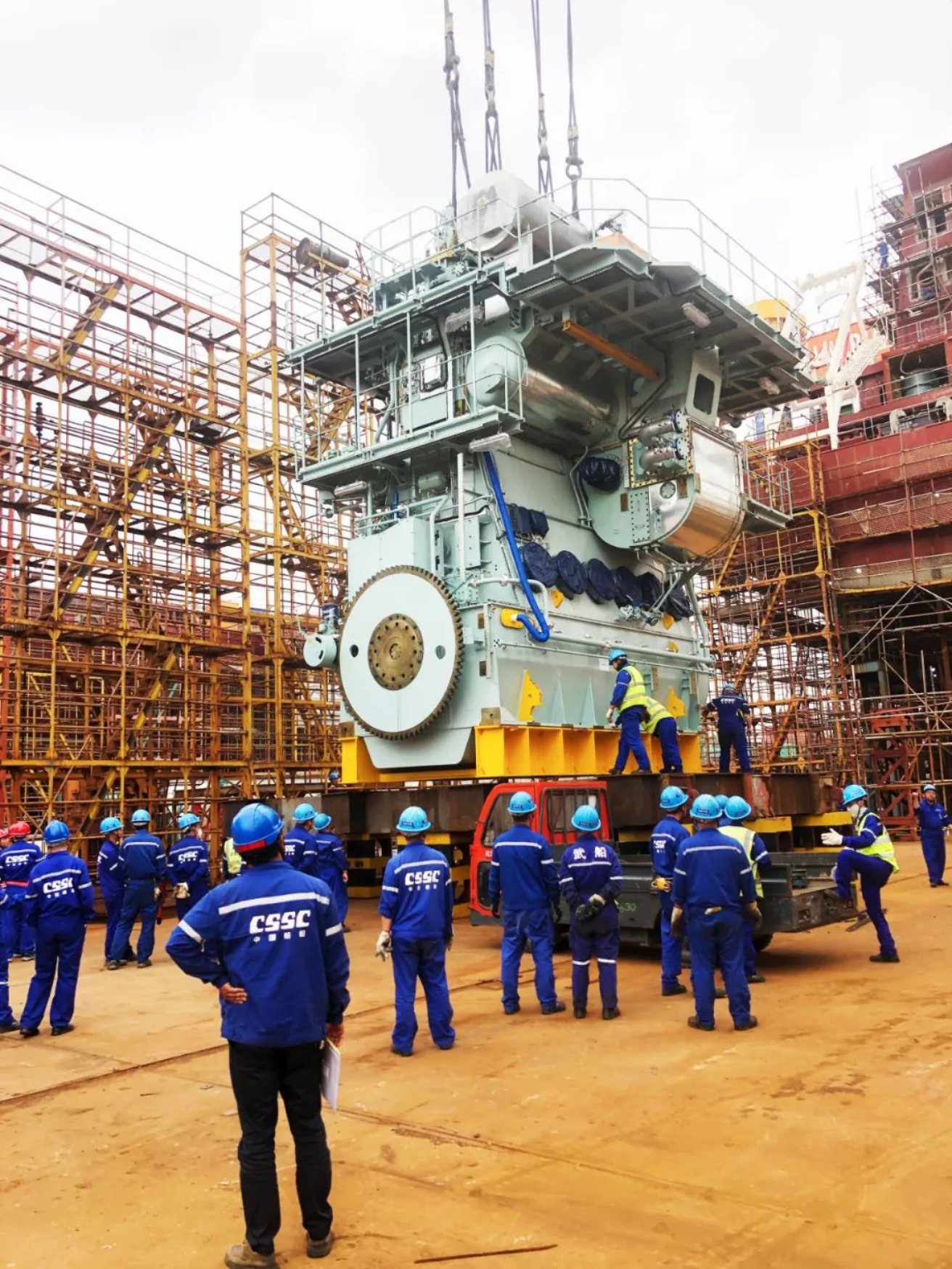 5月23日,由中國船舶集團武昌造船承建的1100TEU集裝箱船1號船主機(整機發(fā)運235噸),在雙柳廠區(qū)二號碼頭順利拖船至斜船架,起坡、轉(zhuǎn)運至300噸吊車覆蓋區(qū)域,經(jīng)過各部門領(lǐng)導(dǎo)和員工的戮力同心,1100TEU集裝箱船1號船主機于當(dāng)天下午17:38分安全轉(zhuǎn)運至48米跨主機放置區(qū)域。1100TEU集裝箱船1號船主機船運至武昌造船碼頭,是武昌造船民船歷史上首次實現(xiàn)主機整船起坡、轉(zhuǎn)運、吊裝。此次順利完成起坡、轉(zhuǎn)運和吊裝工作,為后續(xù)主機進艙安裝工作奠定堅實基礎(chǔ)。