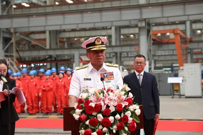 中船重工副總經(jīng)理何紀(jì)武、馬來西亞皇家海軍司令卡瑪魯扎曼上將赴開工現(xiàn)場并致辭??ì旚斣?,何紀(jì)武,莫實德船廠總裁拉姆利,國防科工局軍貿(mào)與外事司副巡視員馬衛(wèi)華,中船重工總經(jīng)理助理、中國船貿(mào)黨委書記、董事長徐子秋,武船集團(tuán)黨委書記、董事長楊志鋼共同觸摸水晶球,啟動切割指令。